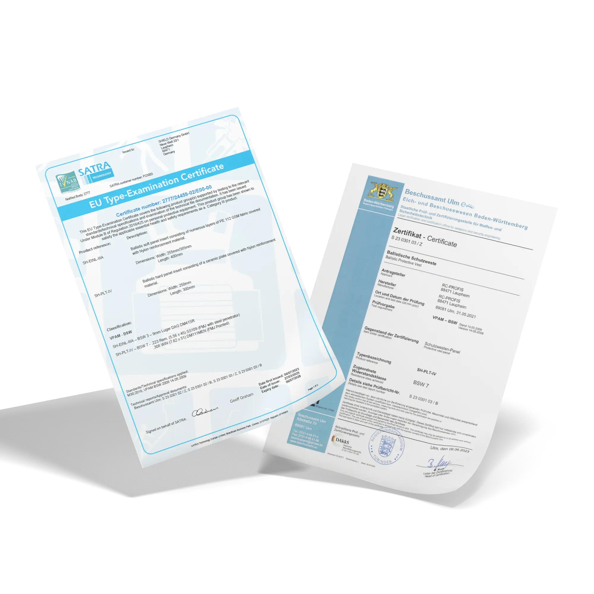 Jedes Produkt wird vom Beschussamt Ulm nach VPAM BSW 2006 geprüft und CE-zertifiziert.
