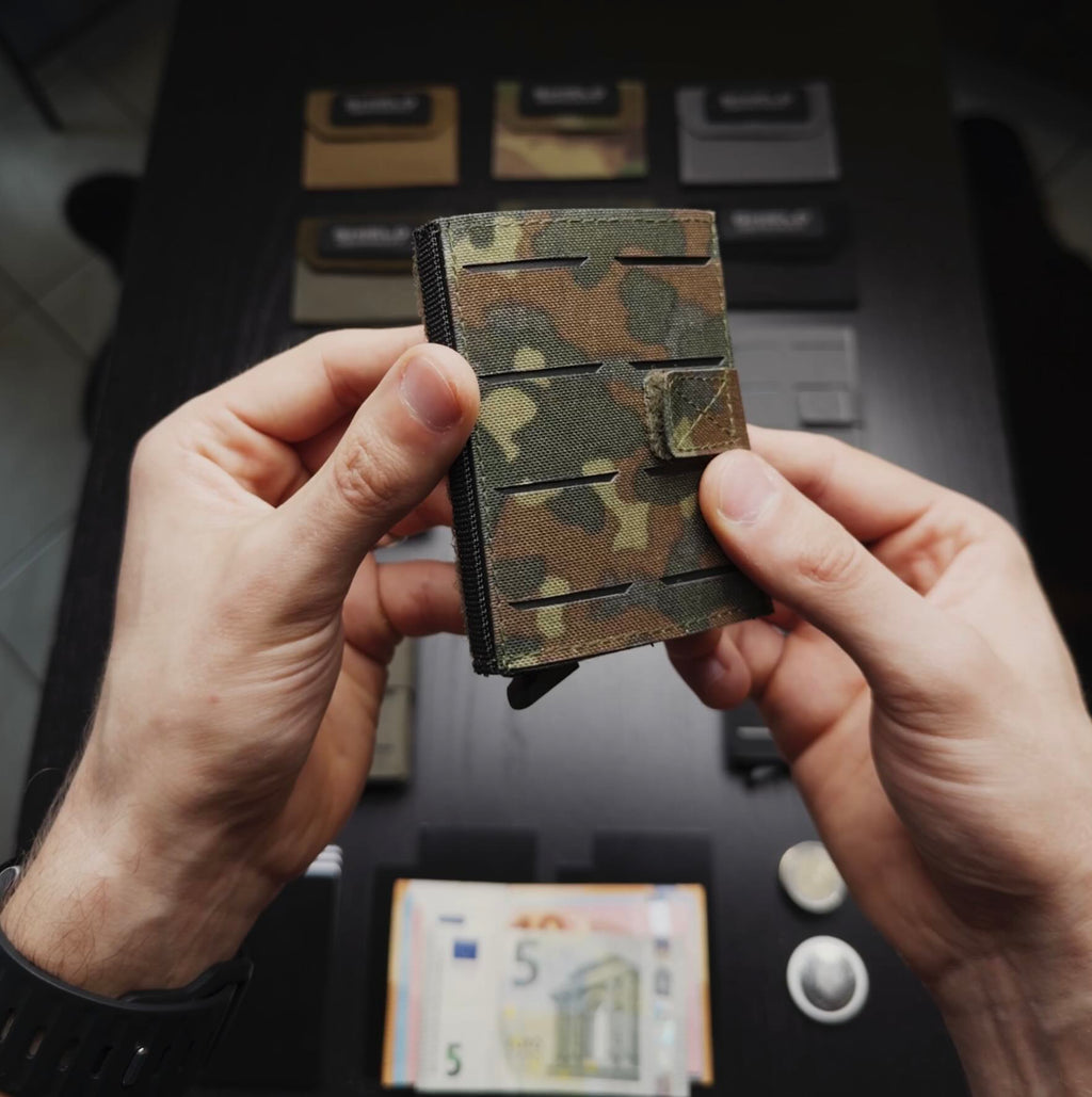 Der neue Aluminium-Kartenhalter ist per Klett sicher integrierbar und kann bei Bedarf auch separat genutzt werden, z. B. auf dem SHIELD Tactical Phone Case. Im Wallet selbst finden 6 Karten und Scheingeld Platz – ideal für jede Lage. Das neue PALS-Design mit trapezförmigen Laser-Cuts sorgt für einen modernen, kantigen Look.