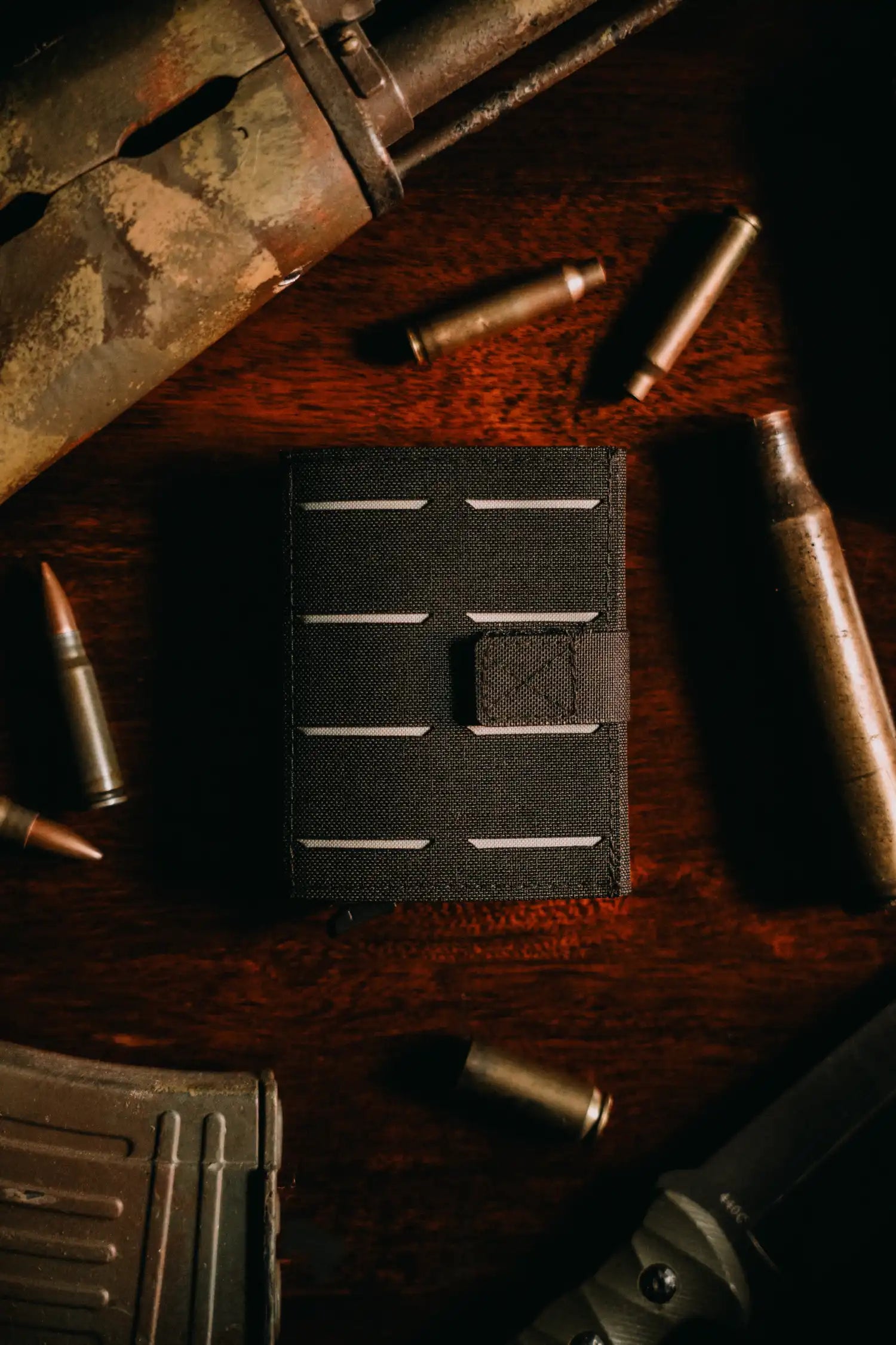 Der neue Aluminium-Kartenhalter ist per Klett sicher integrierbar und kann bei Bedarf auch separat genutzt werden, z. B. auf dem SHIELD Tactical Phone Case. Im Wallet selbst finden 6 Karten und Scheingeld Platz – ideal für jede Lage. Das neue PALS-Design mit trapezförmigen Laser-Cuts sorgt für einen modernen, kantigen Look.